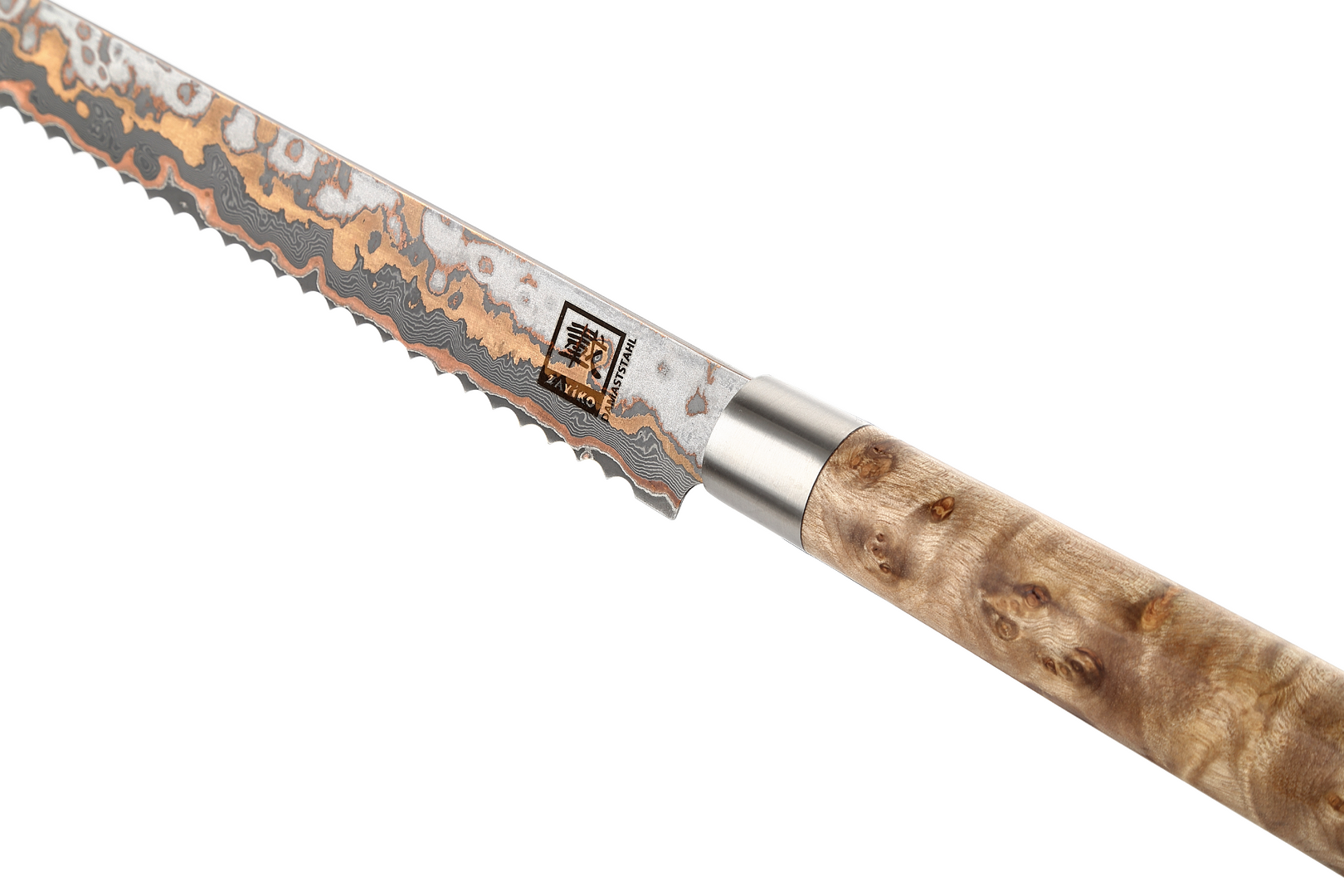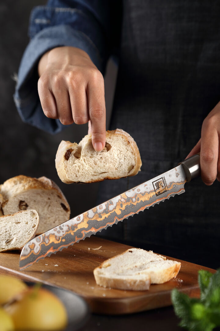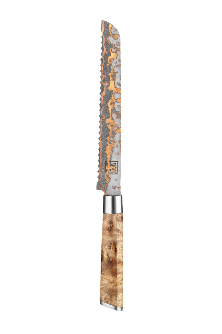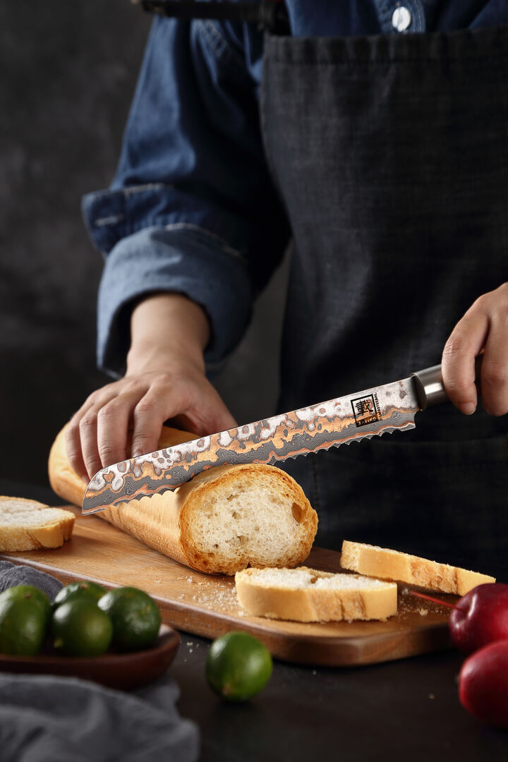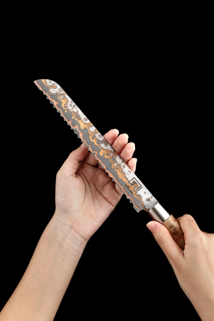 Das Zayiko MysticMagma Brotmesser: Seine 20 cm lange Wellenschliff-Klinge aus 67 Lagen Damaststahl mit Kupfer- und Bronze-Einlagen gleitet mühelos durch knusprige Krusten und weiches Gebäck und sorgt für saubere, gleichmässige Schnitte.