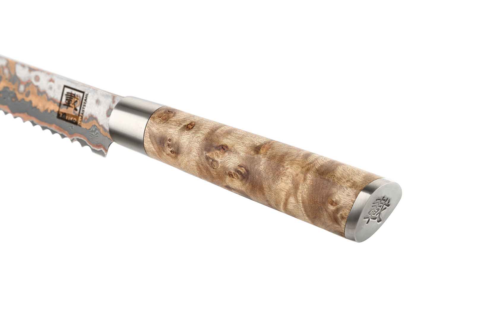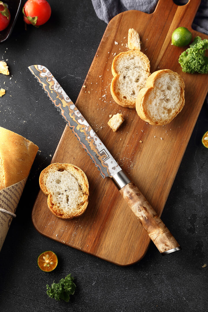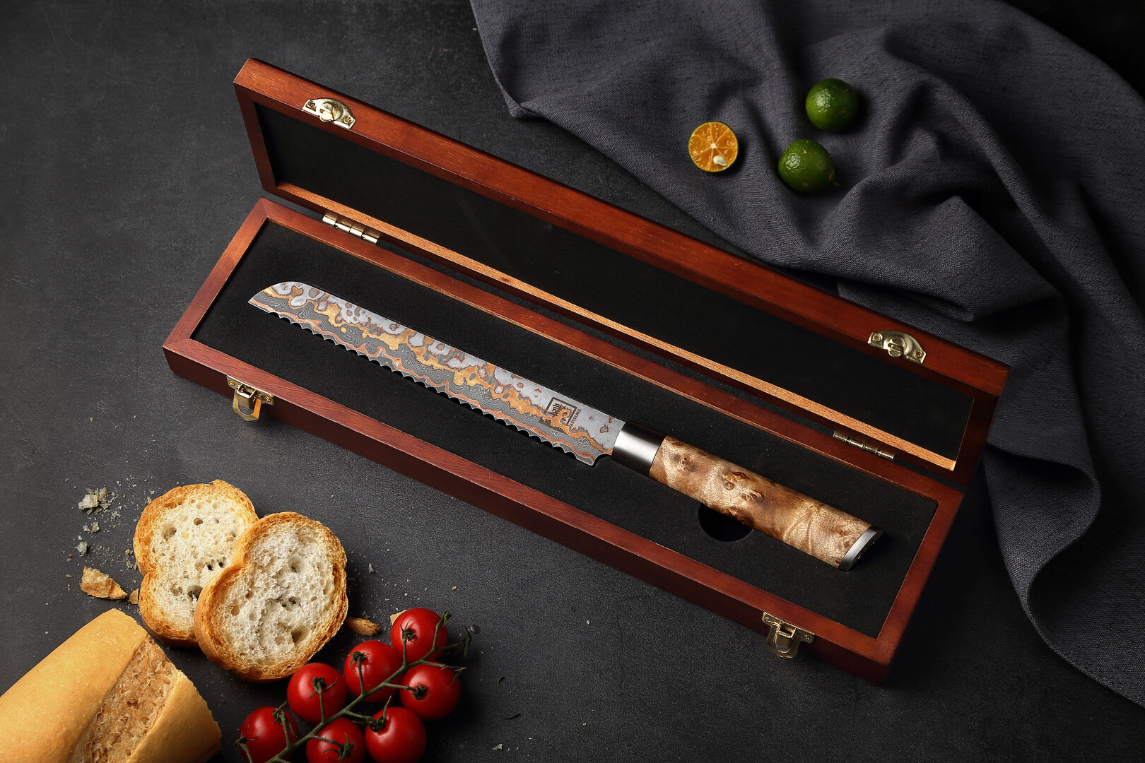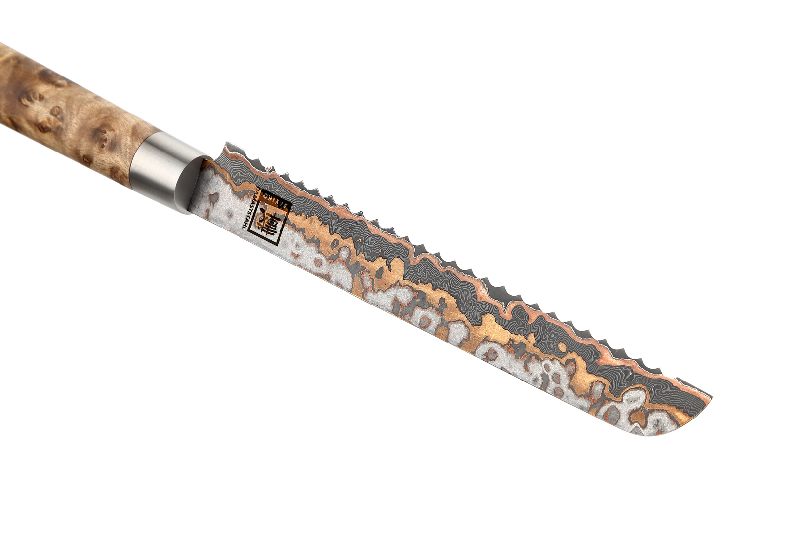 Das Zayiko MysticMagma Brotmesser: Seine 20 cm lange Wellenschliff-Klinge aus 67 Lagen Damaststahl mit Kupfer- und Bronze-Einlagen gleitet mühelos durch knusprige Krusten und weiches Gebäck und sorgt für saubere, gleichmässige Schnitte.