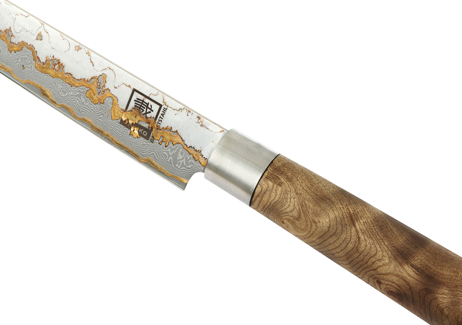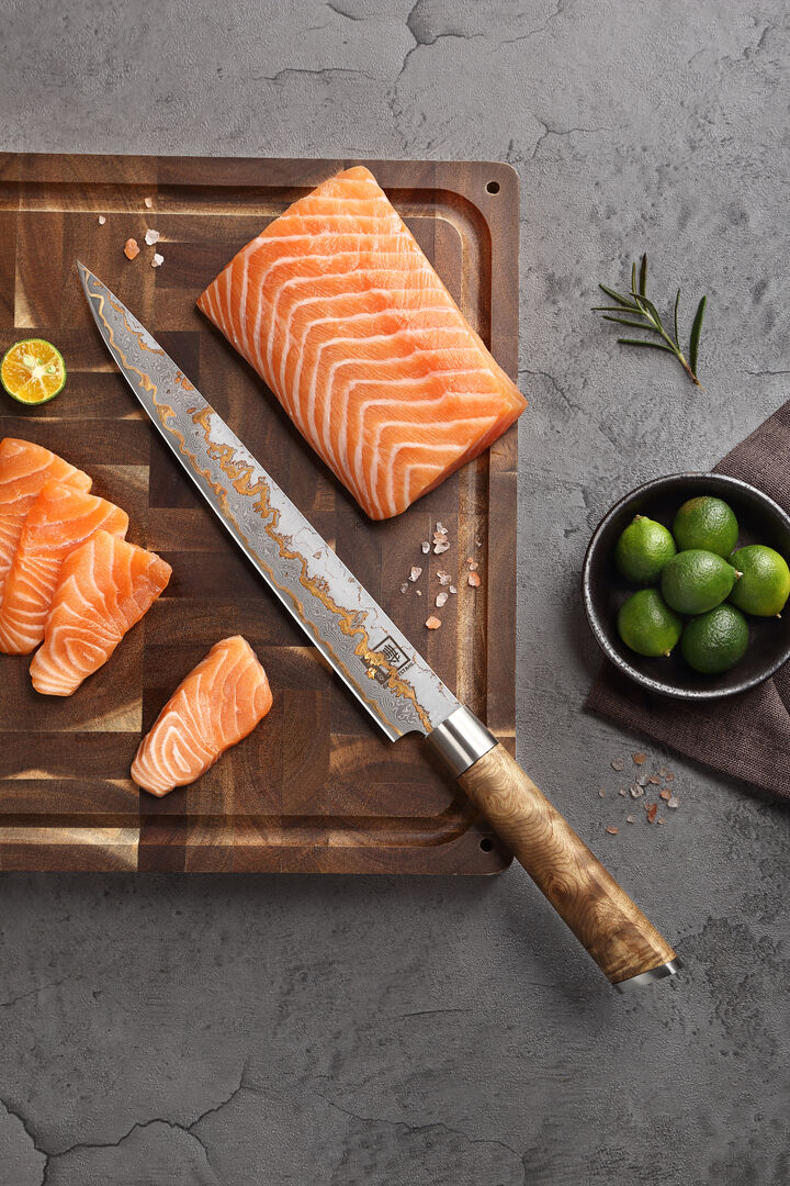 Das Zayiko MysticMagma Sashimimesser: Seine 25 cm lange Klinge aus 67 Lagen VG10Damaststahl mit Kupfer. und Bronze-Einlagen ermöglicht hauchdünne, saubere Schnitte – ideal für Sashimi, Sushi oder feinste Fischfilets.