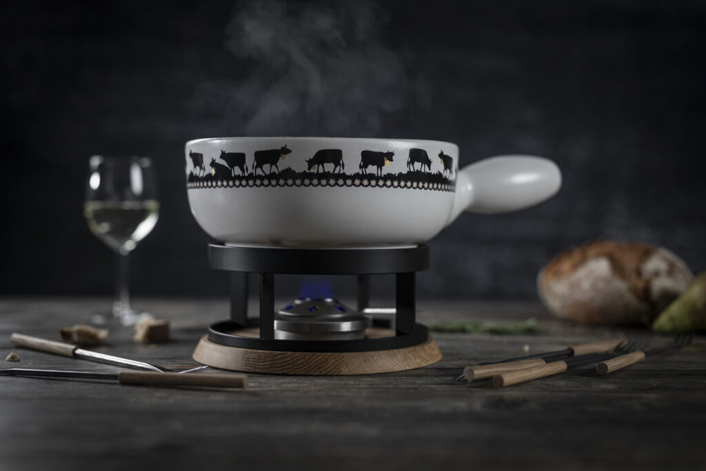 Das Goldglocke Käsefondueset von Kuhn Rikon vereint alpine Tradition mit elegantem Design. Das Caquelon aus hochwertiger weisser Tonmasse zeigt einen stilvollen Scherenschnitt mit grasenden Kühen und feinen Blumenakzenten, ergänzt durch kleine Echtgold-Details.