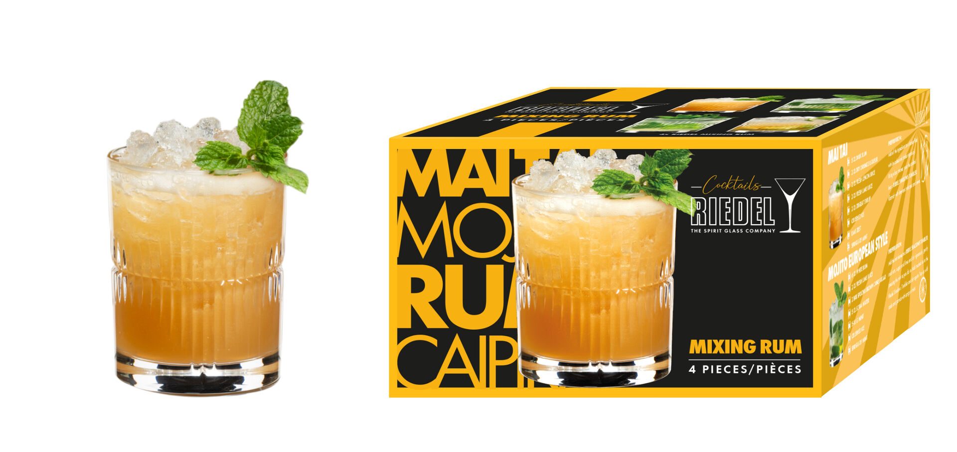 Das RIEDEL Mixing Rum Set: Es besteht aus klarem Kristallglas und umfasst vier elegant designte Becher von Maximilian J. Riedel mit linearem Dekor und passenden Cocktailrezepten von Meike Zimmerman. Das Set eignet sich ideal für stilvolle Rum-Kreationen und Cocktailliebhaber zu Hause oder als Geschenk.